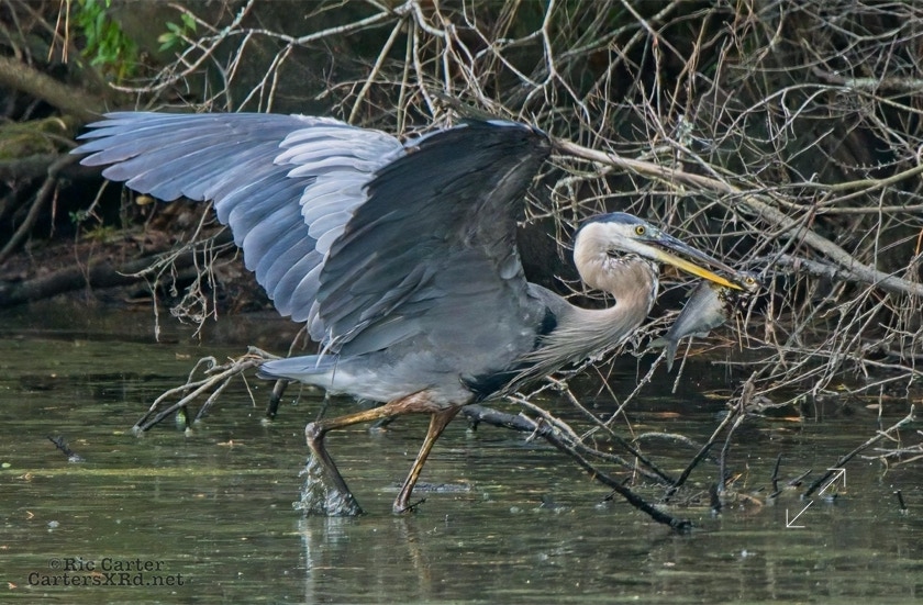There’s a little canal off the Pamlico River between Summerhaven and Shady Banks east of Washington NC. On July 27, I got to watch a great blue heron snag a catch he was mighty proud of. He actually found a surer perch to get the large shad turned and down his gullet.