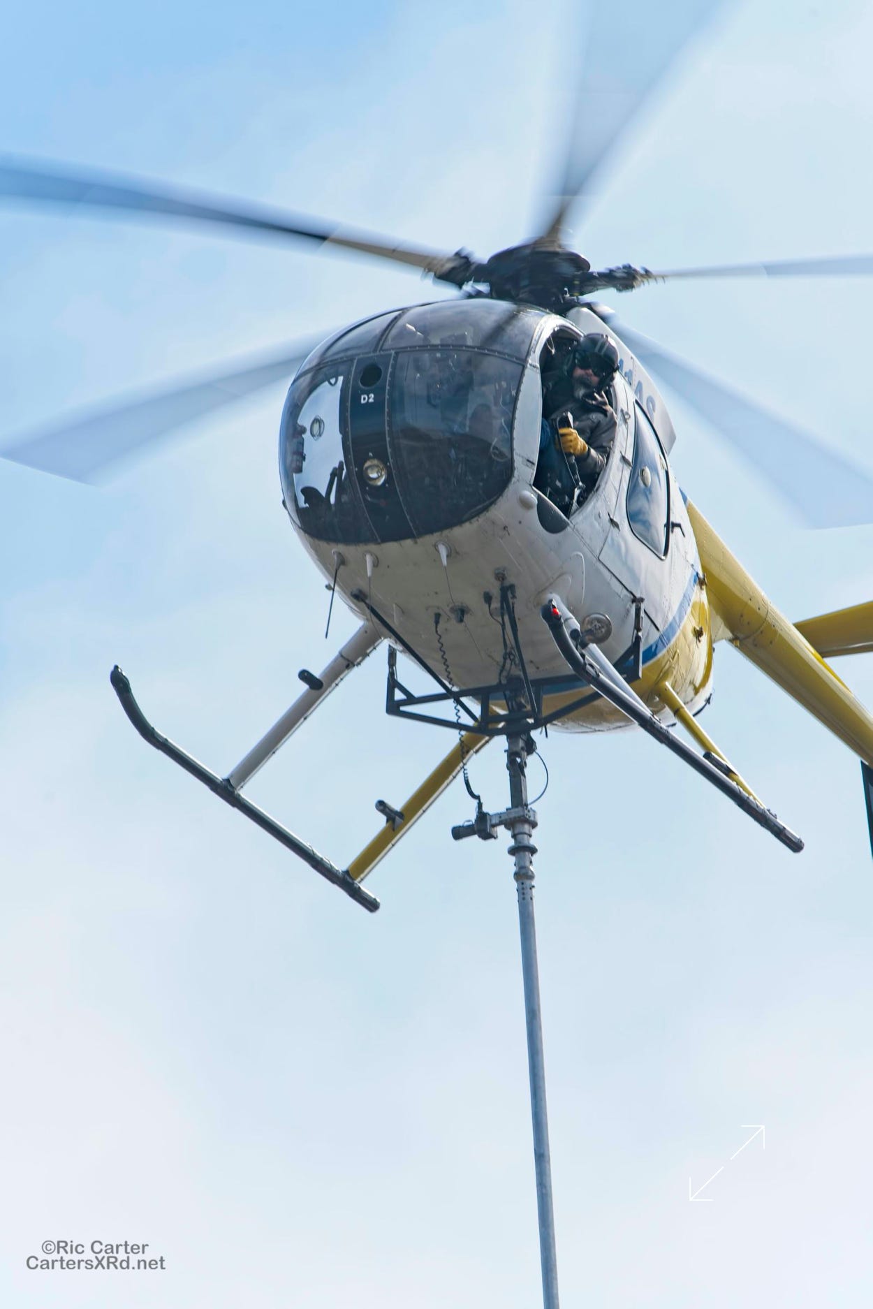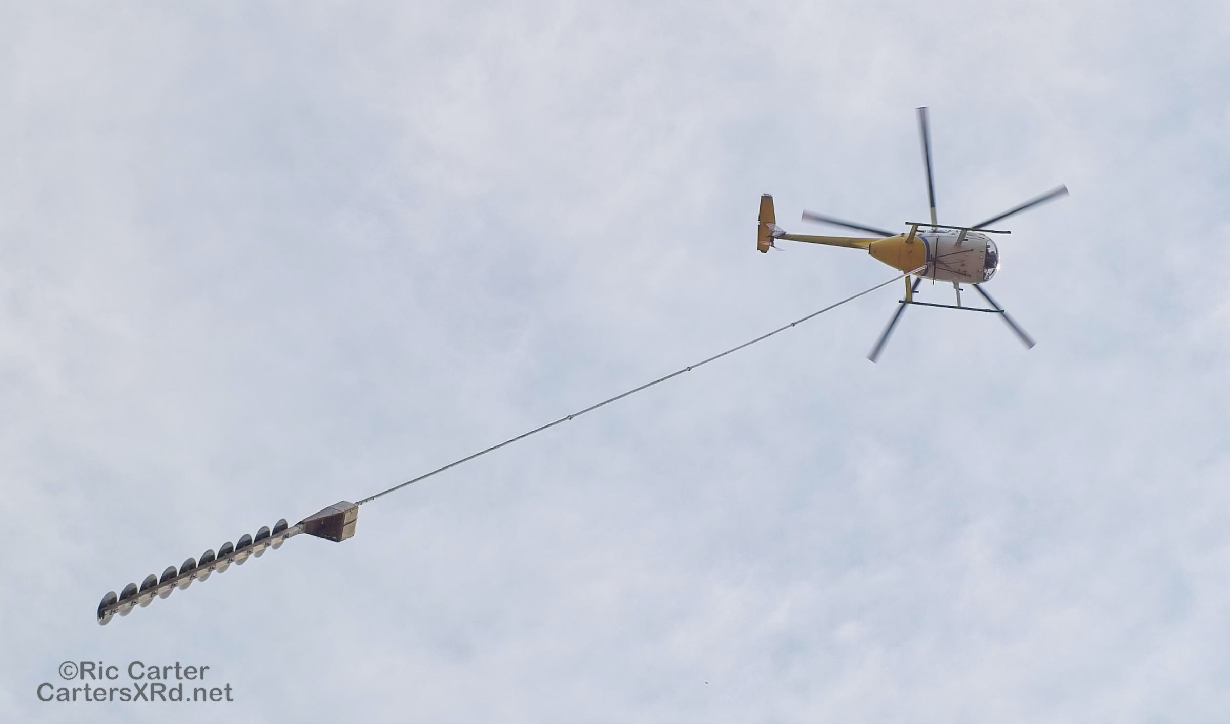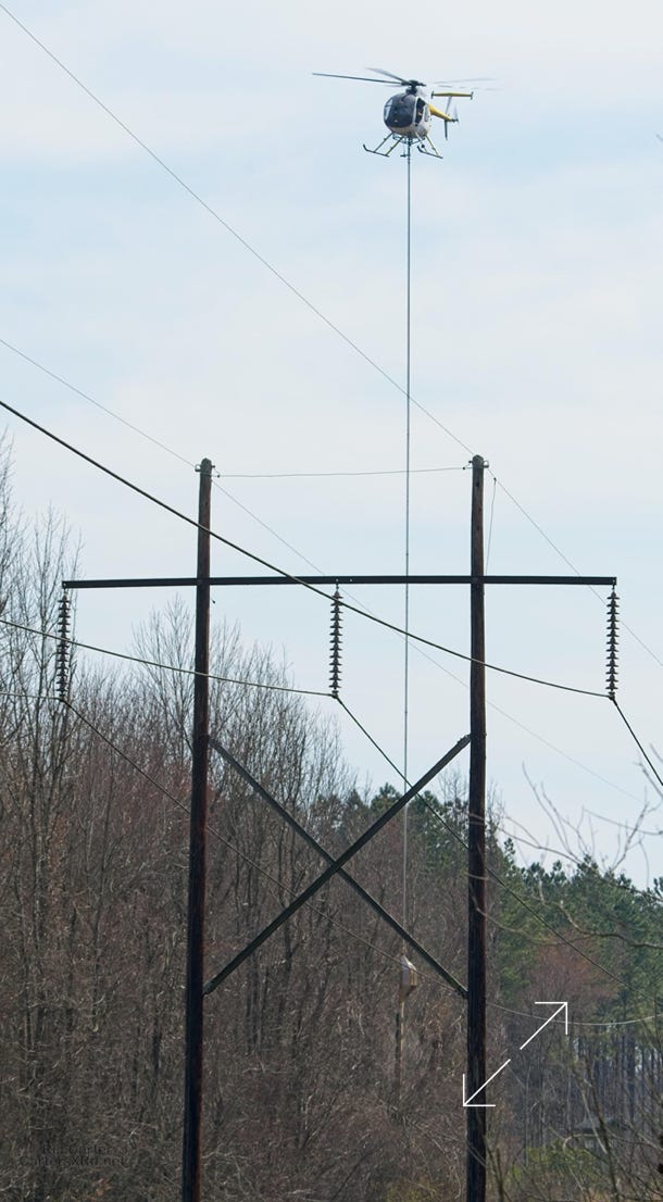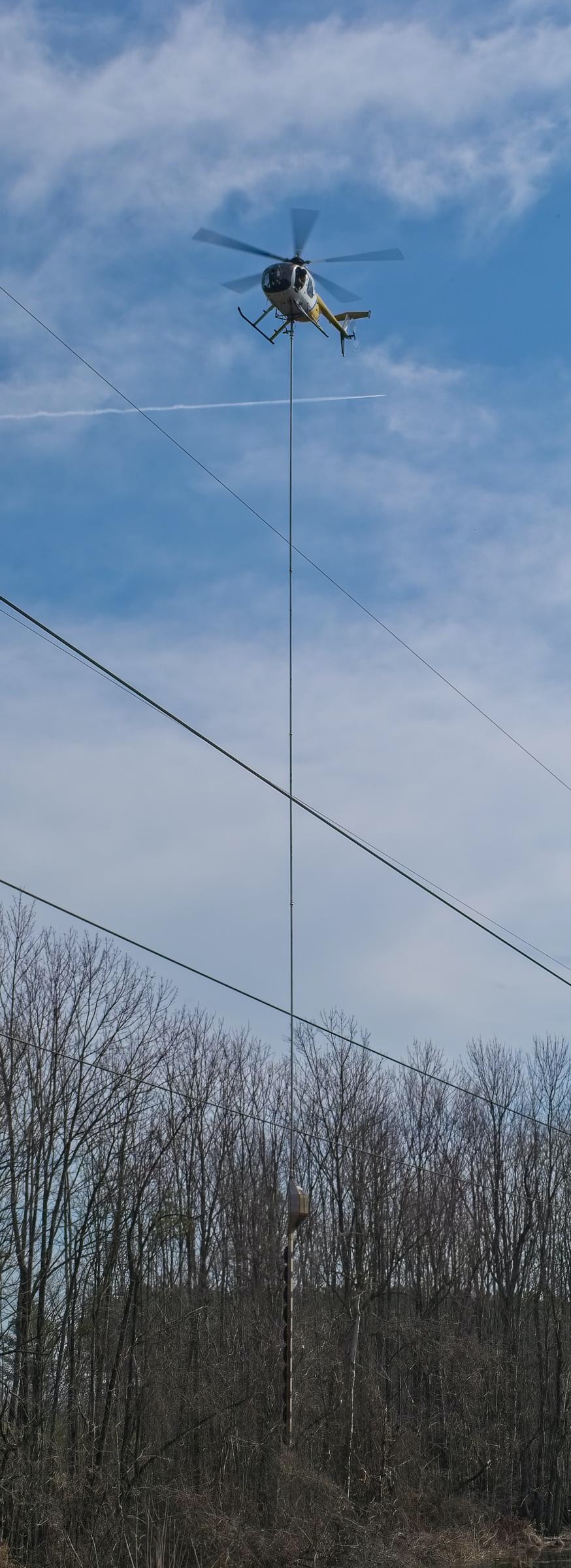 I saw a helicopter low and working south of Grimesland February 12. Then I found the chopper running a chopper along the Duke Energy right-of-way along Chicod Creek. Suspended below the Hughes 369D was a 10-blade circular saw that was being taken along the branches of trees intruding into the right-of-way. Not a simple piloting job, but easier than getting crews into the wetland they were attacking.