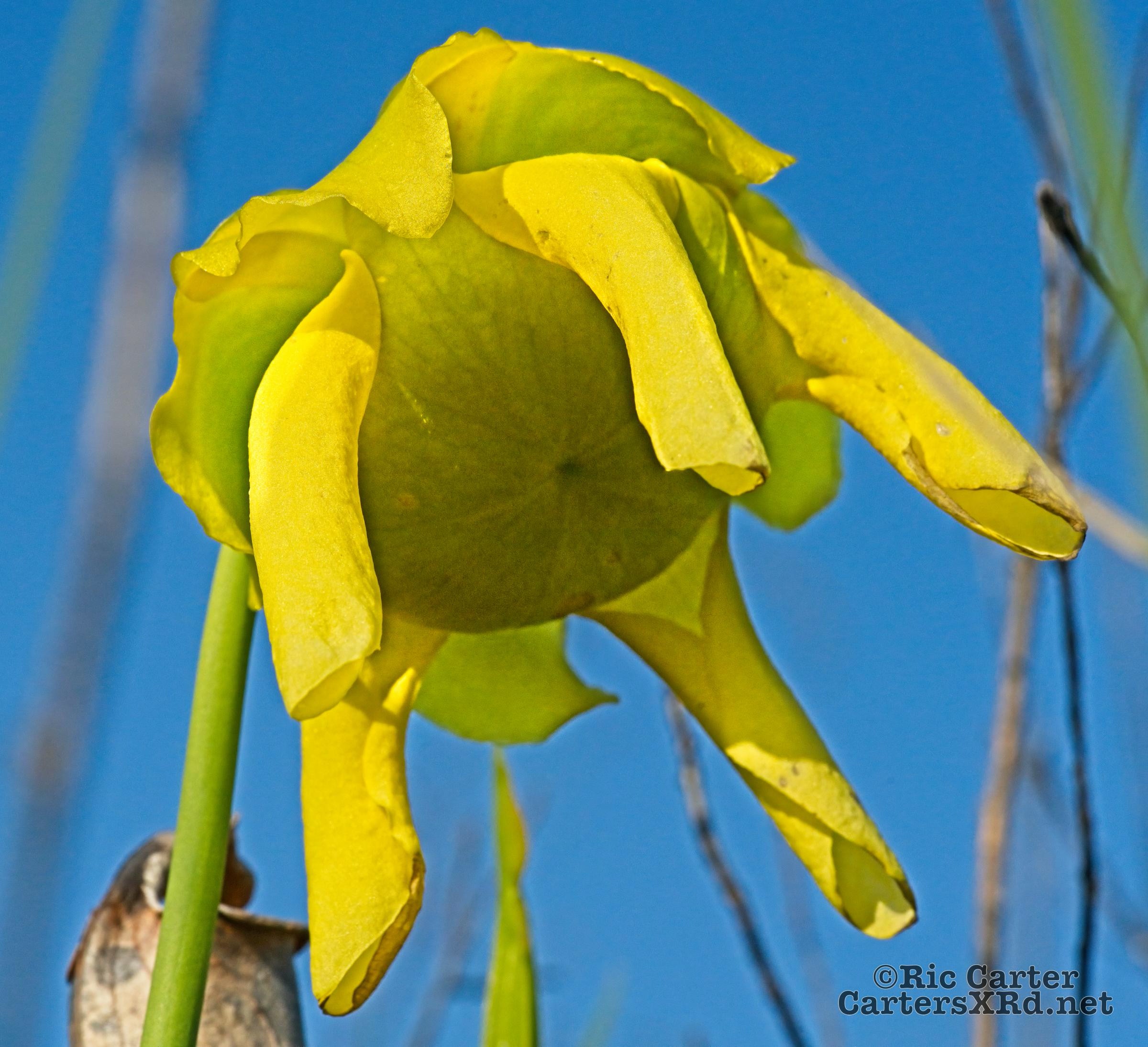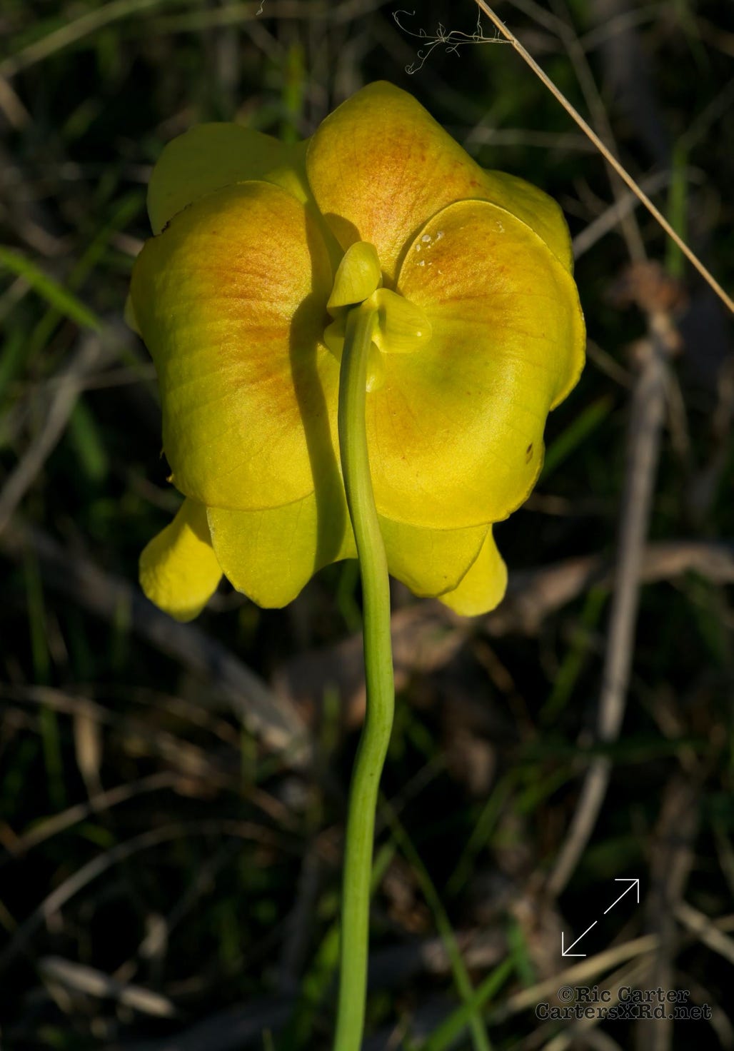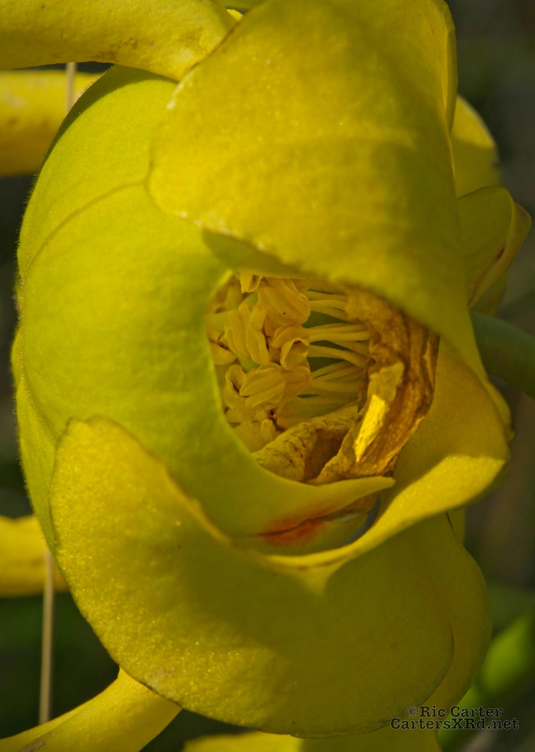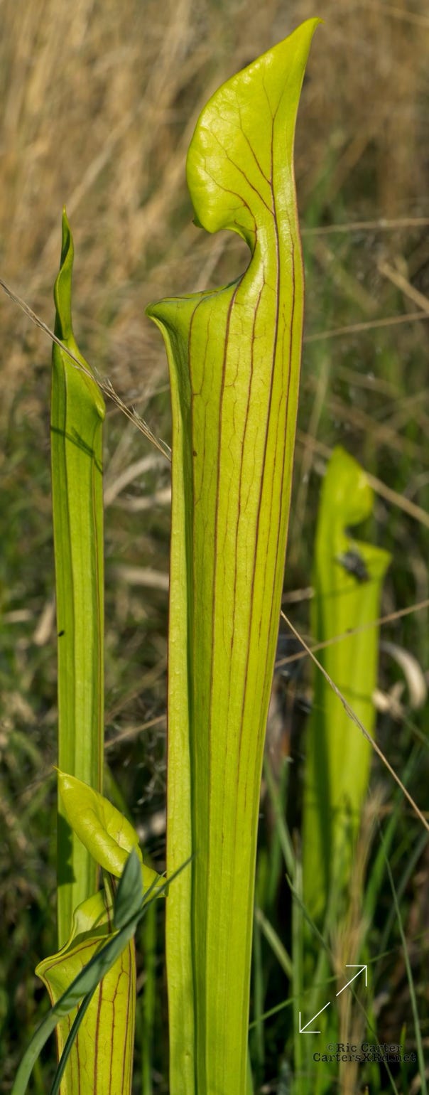 These yellow pitcher plants are blooming at the VOA Gamelands in Beaufort County NC. These carnivorous plants are one of our tallest pitchers. Pitchers are not solely carnivorous, but depend on insect prey to give them needed minerals and other nutrients lacking in the poor soils they occupy. The blossoms are actually insect welcoming, not eating their pollinators. The leafy tube on the right is the bug trap.