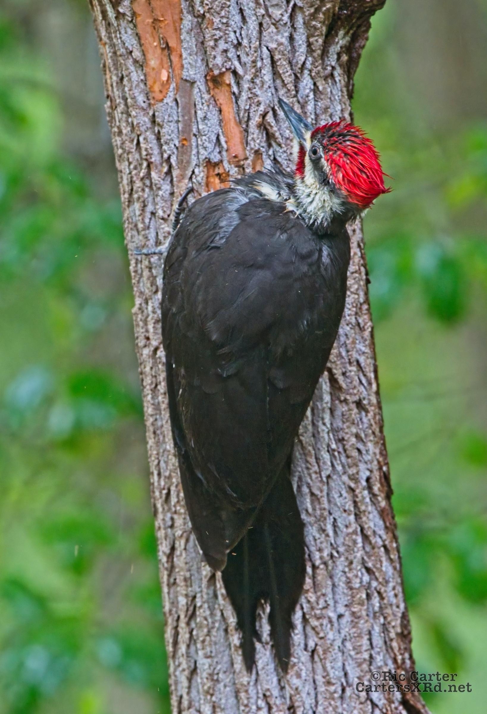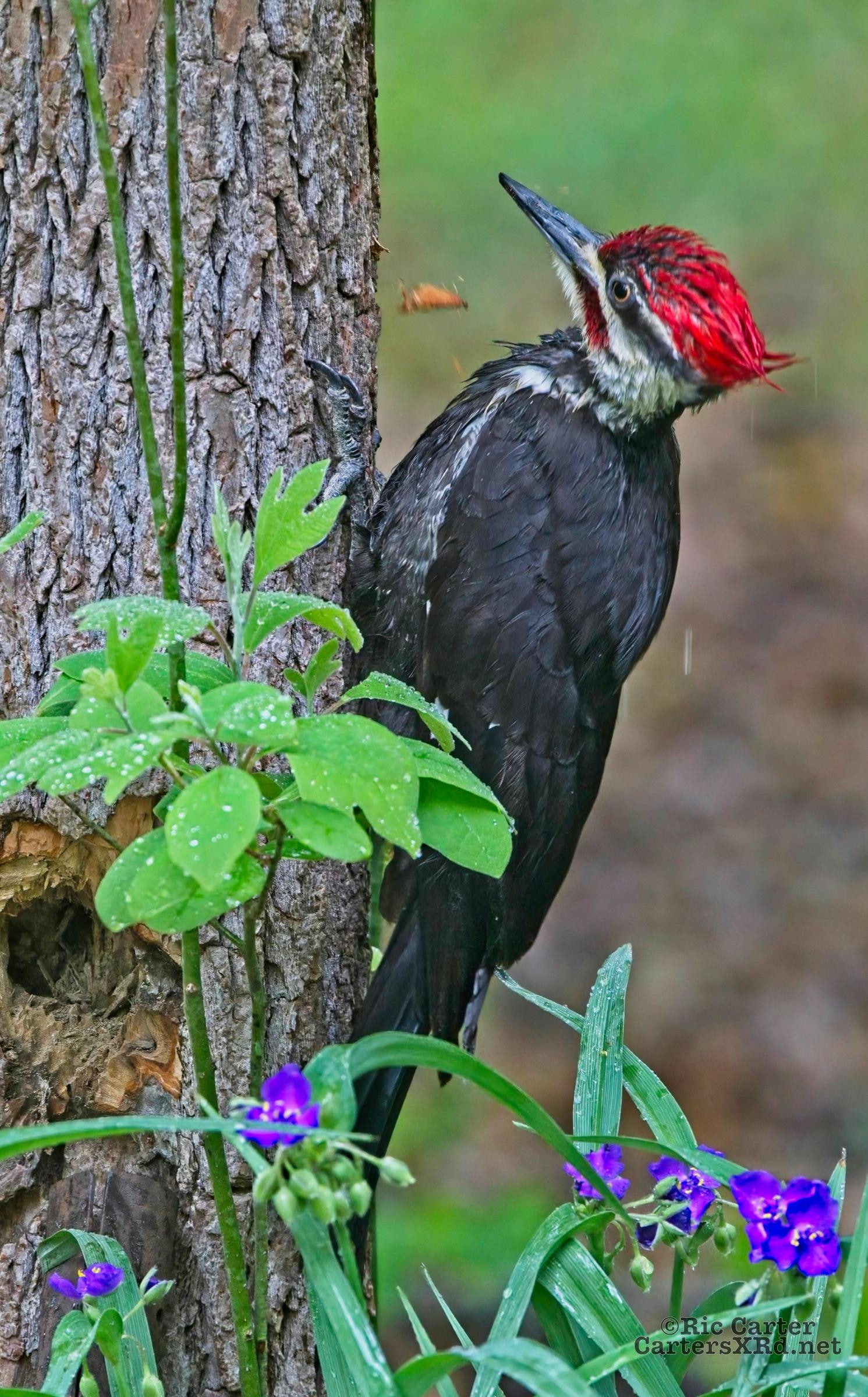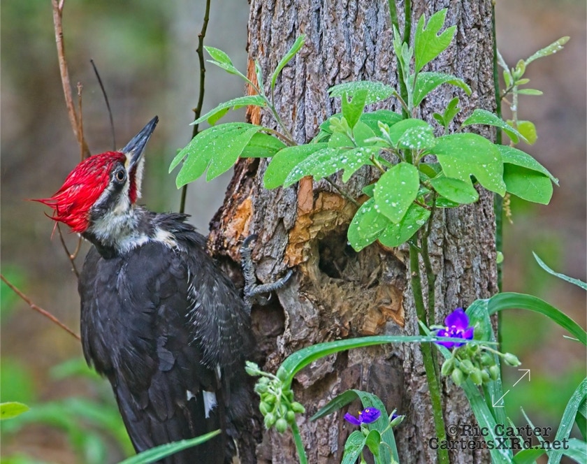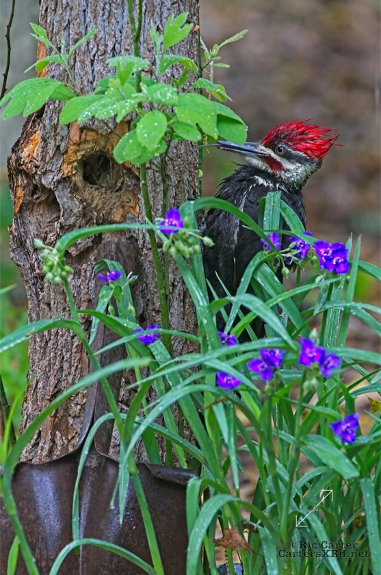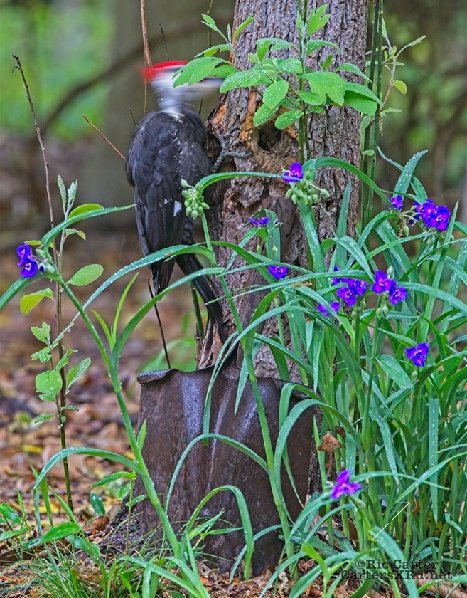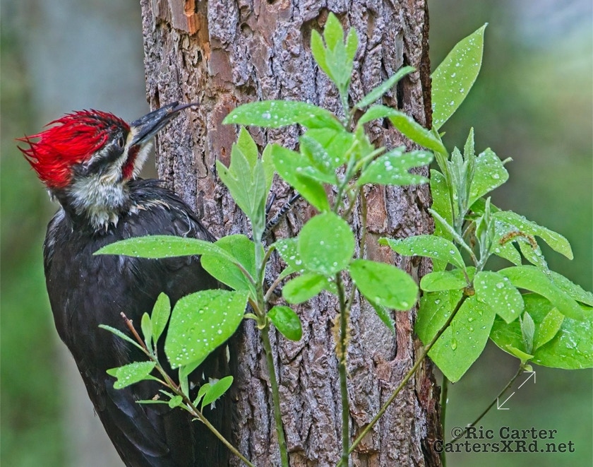 We looked out the window last week on a rainy day. There was a male pileated woodpecker working one of the older sassafras in the backyard. I figured there was no way it would work, but could not leave photographing him untried. He didn’t seem to mind me at all. Maybe he’s seen me hanging around not eating birds. I took these photos April 18, 2022.
