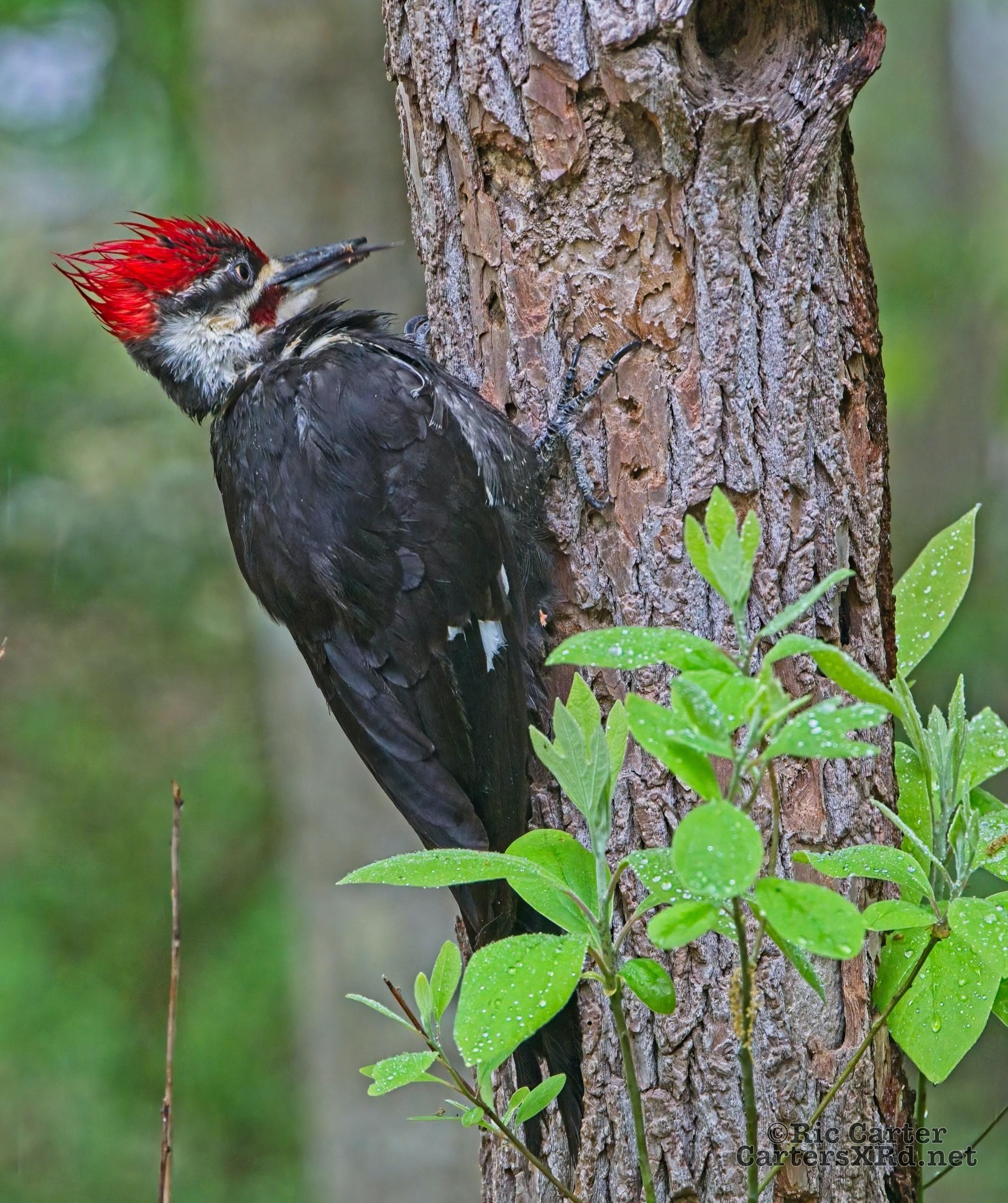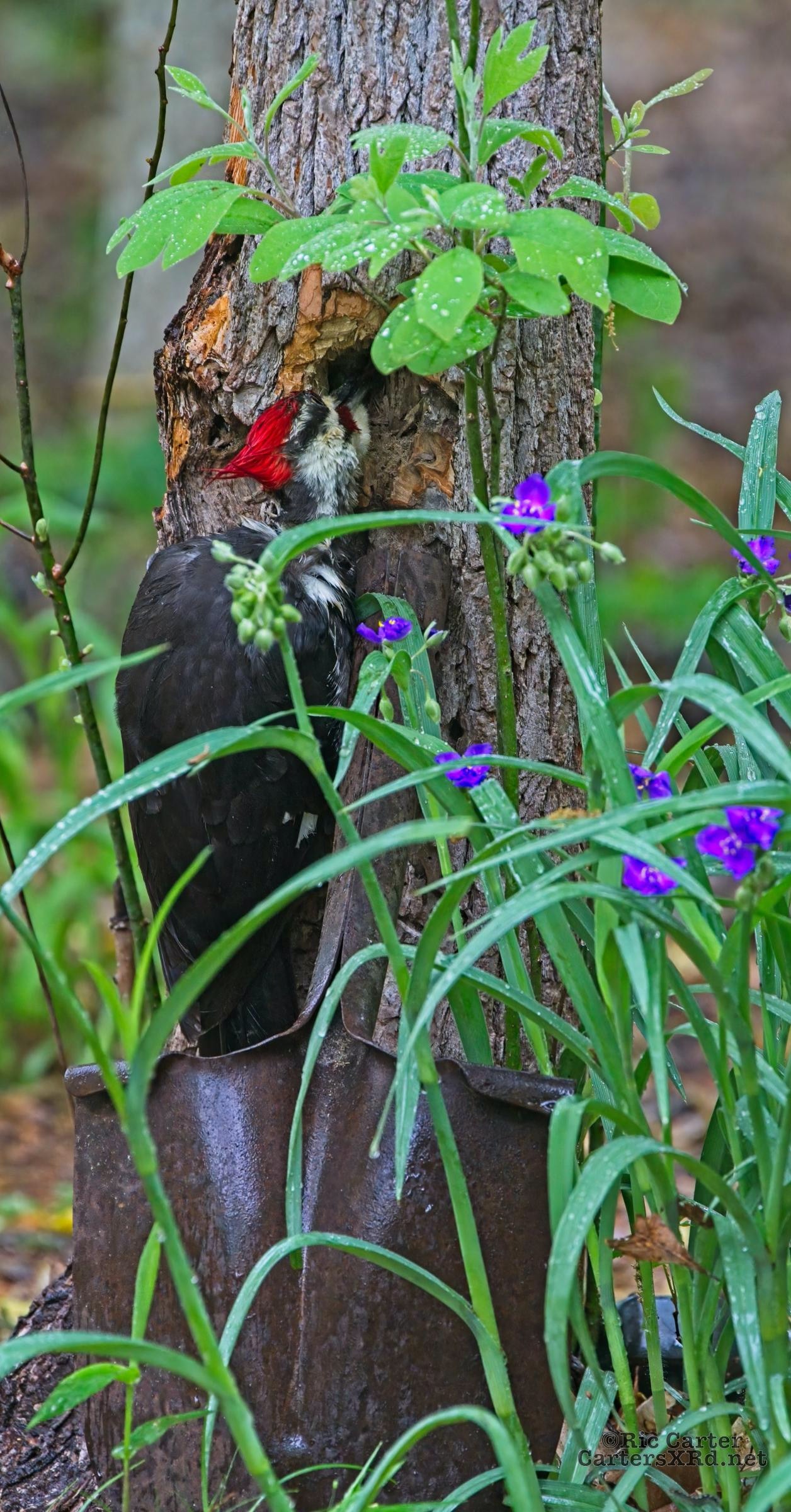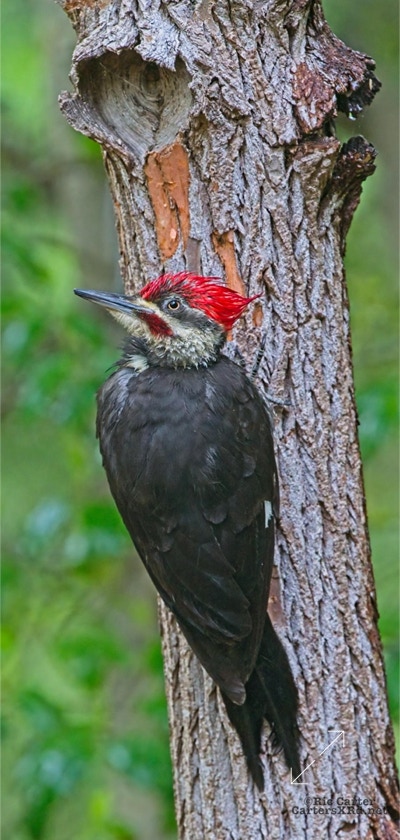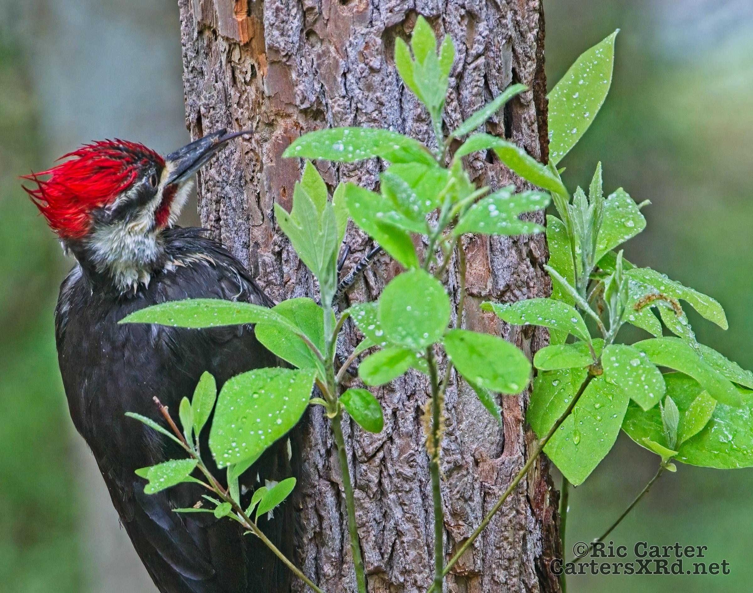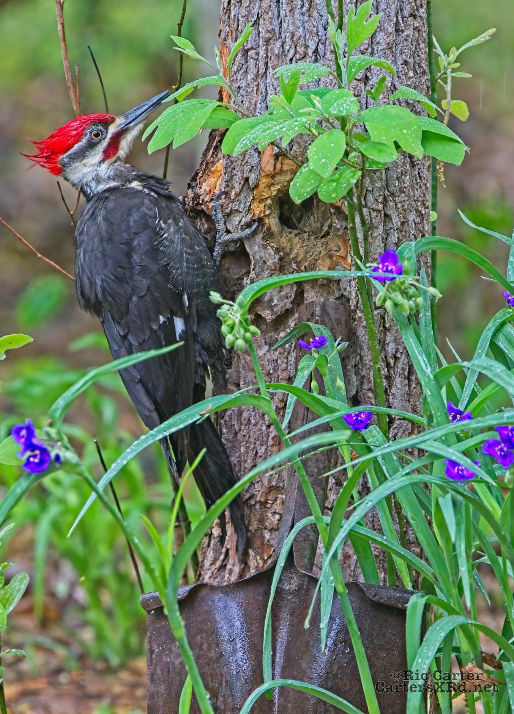We looked out the window last week on a rainy day. There was a male pileated woodpecker working one of the older sassafras in the backyard. I figured there was no way it would work, but could not leave photographing him untried. He didn’t seem to mind me at all. Maybe he’s seen me hanging around not eating birds. I took these photos April 18, 2022.