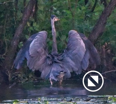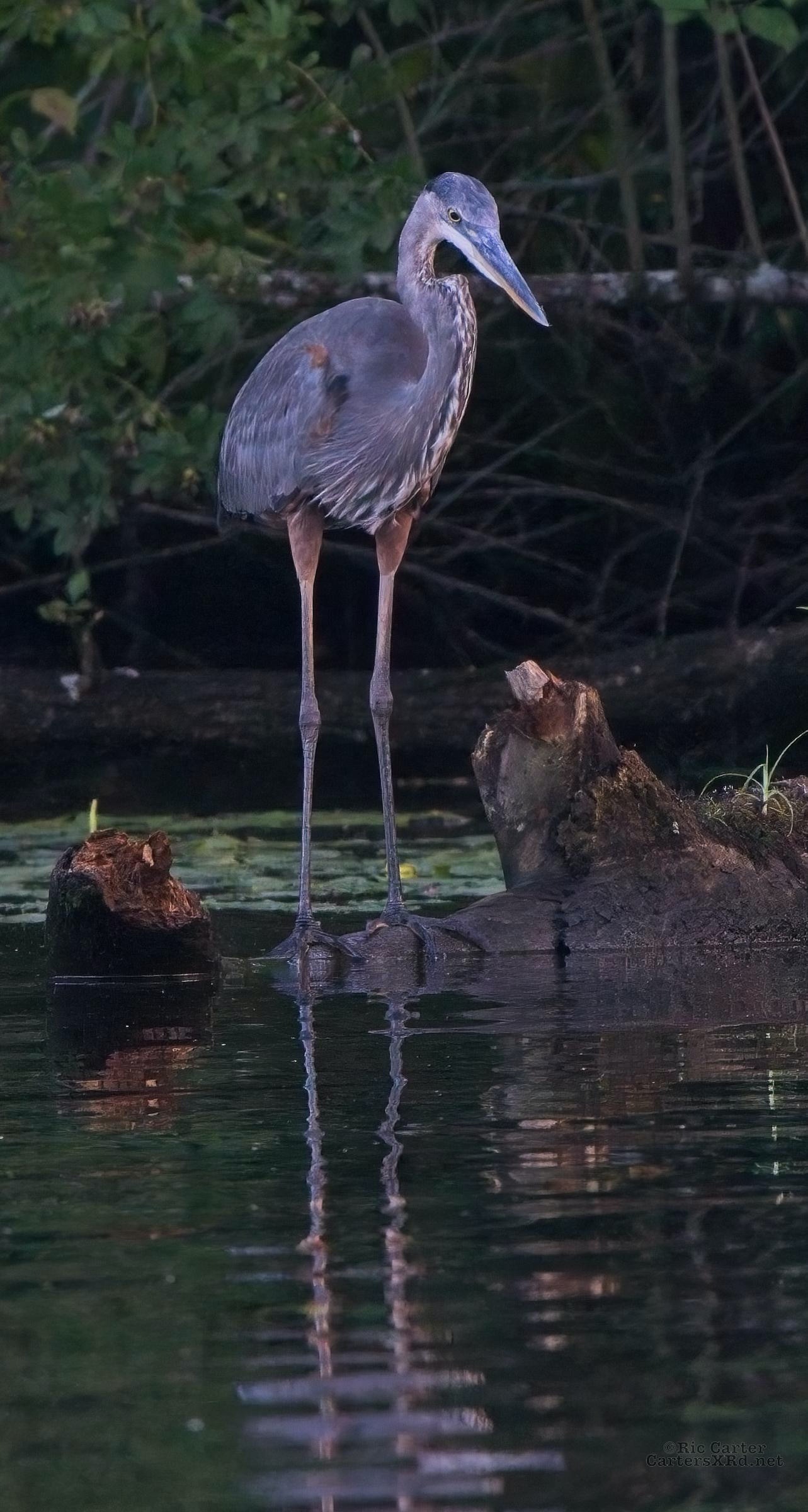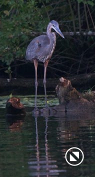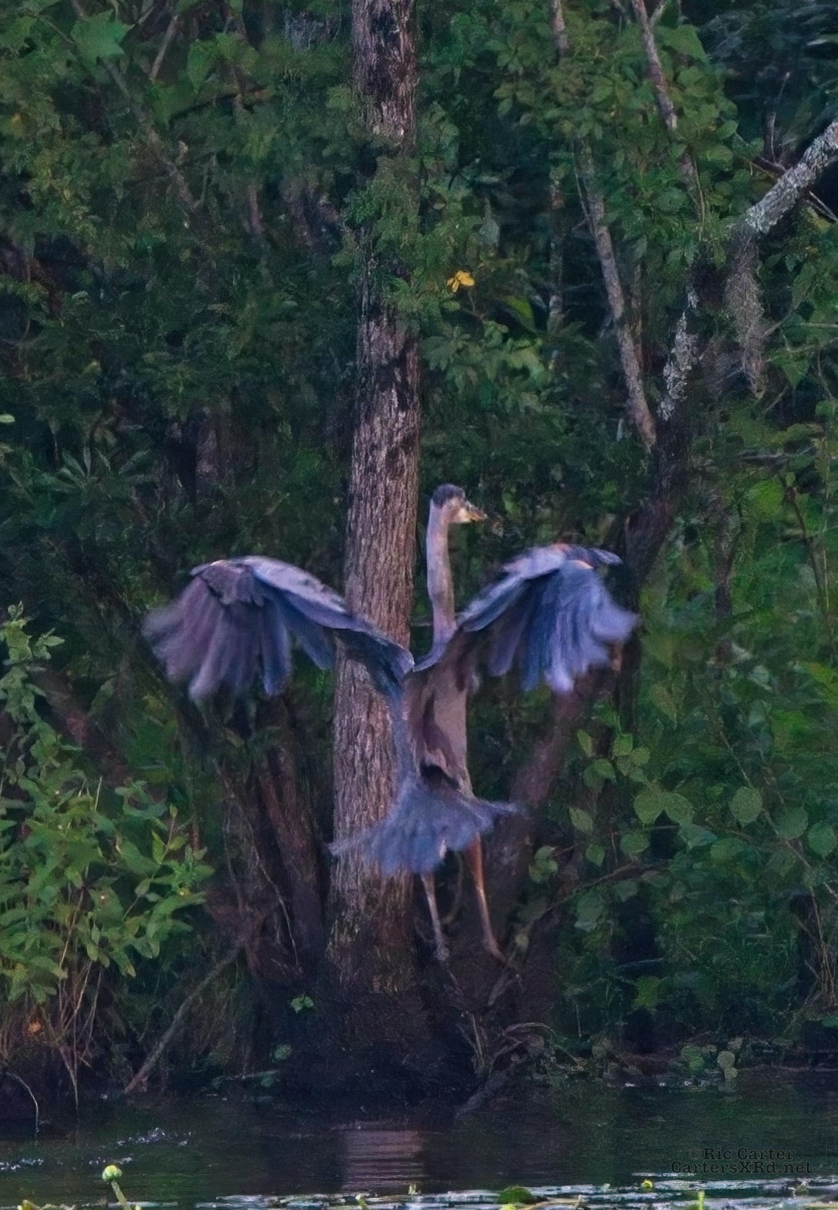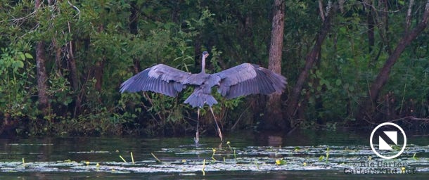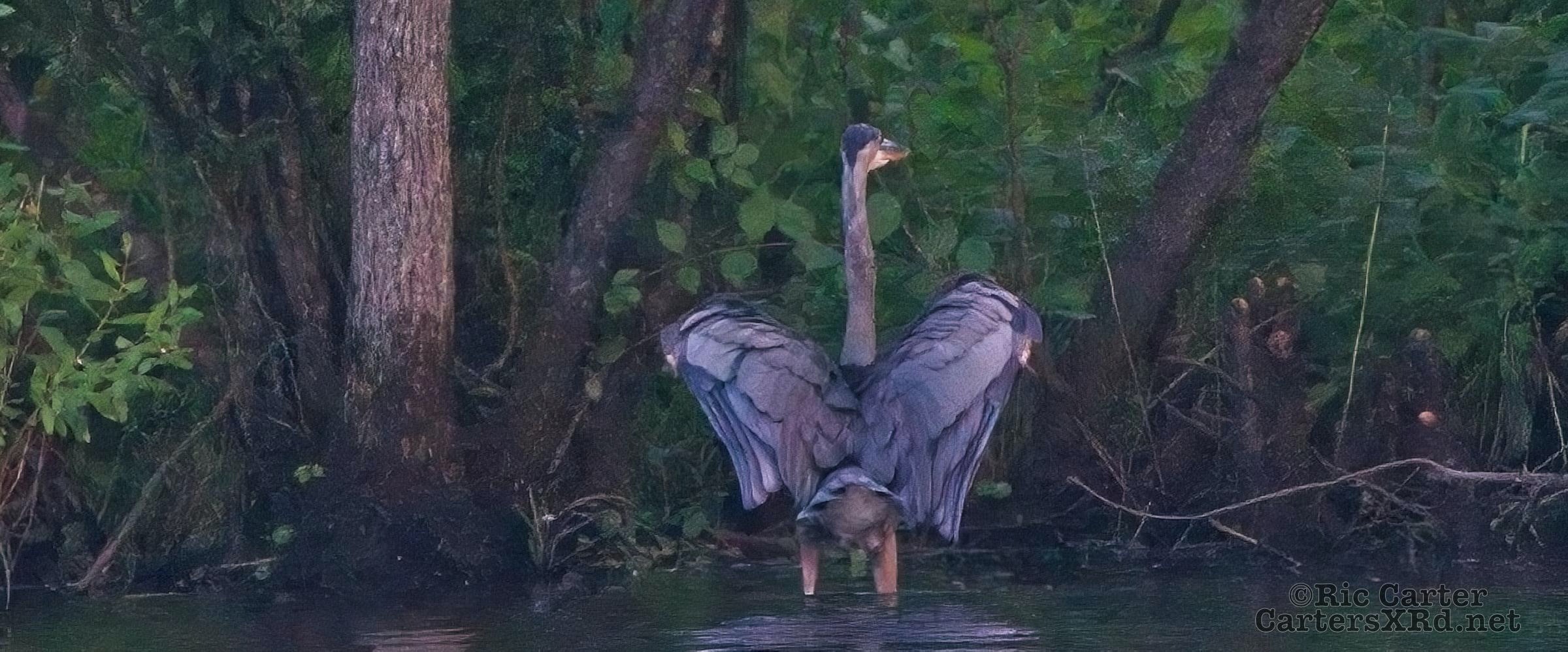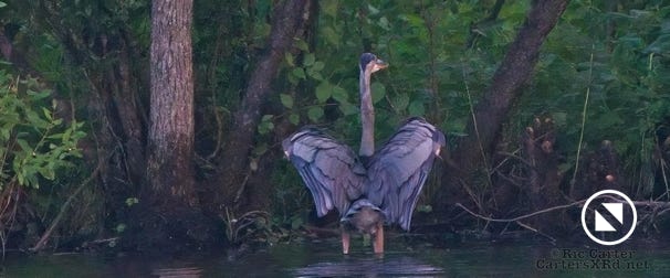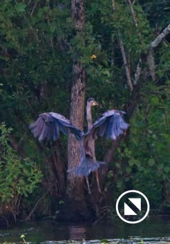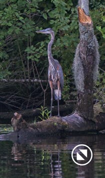 We watched a heron who, as he sometimes does, sat on the other side of the creek watching us at sunset. He got up and moved a little down creek when boat traffic picked up. July 15, 2022.