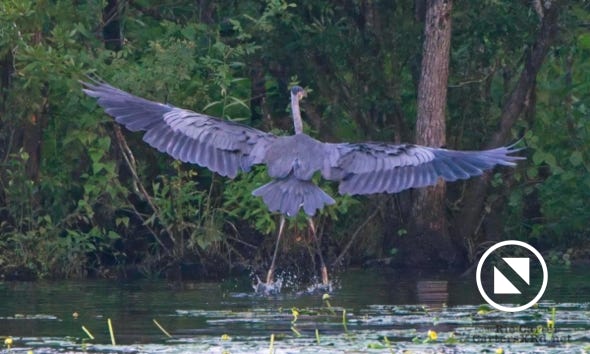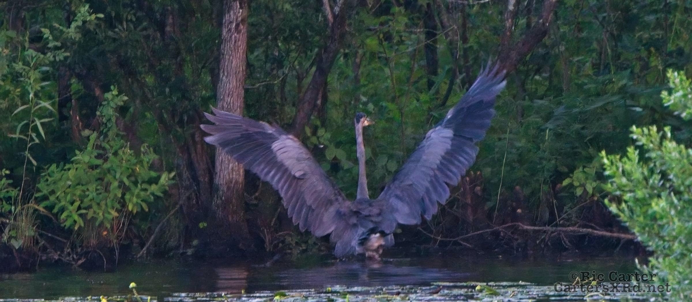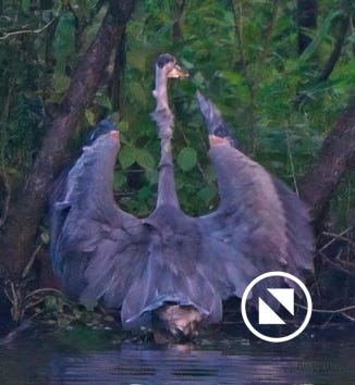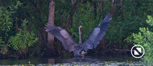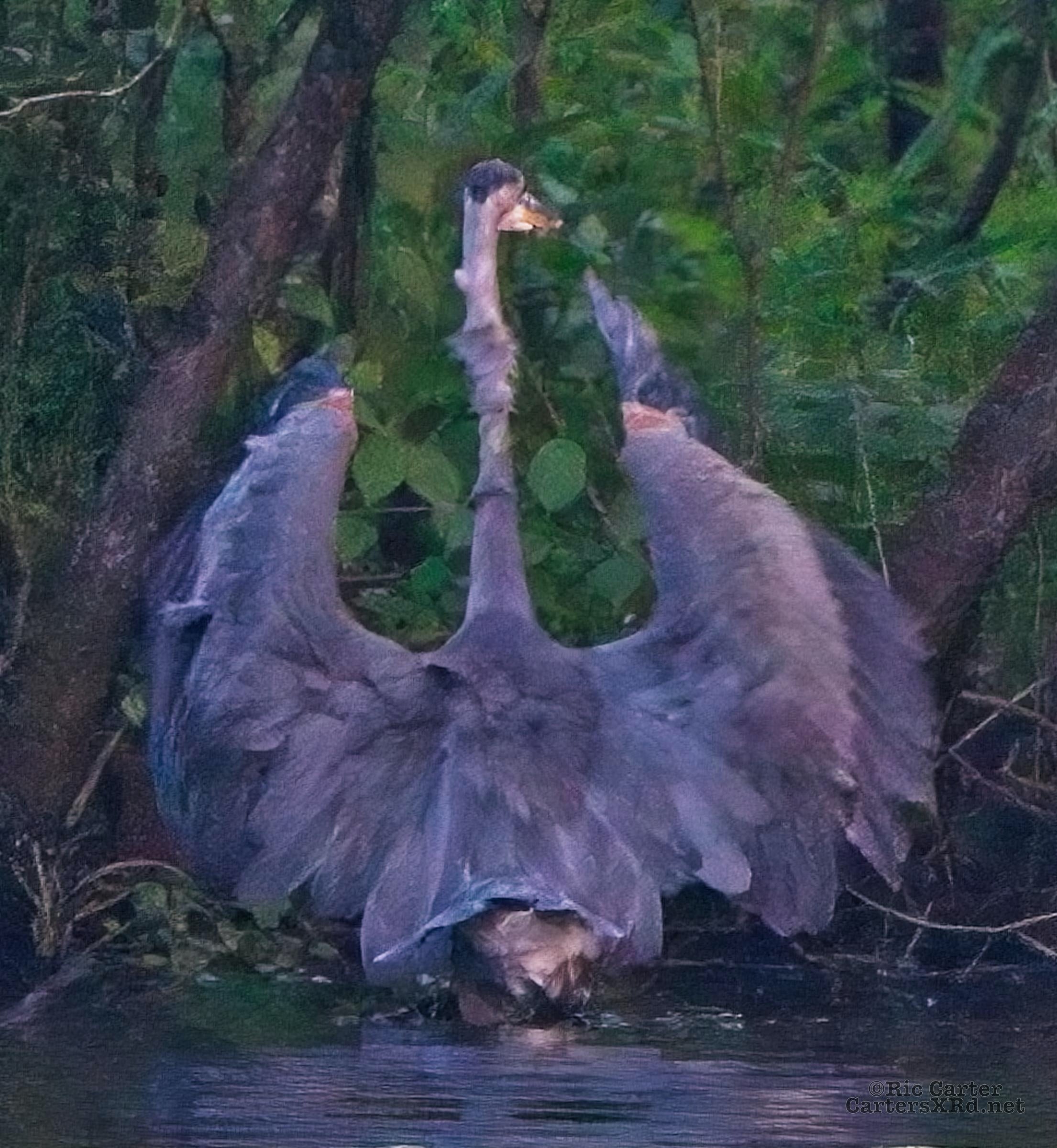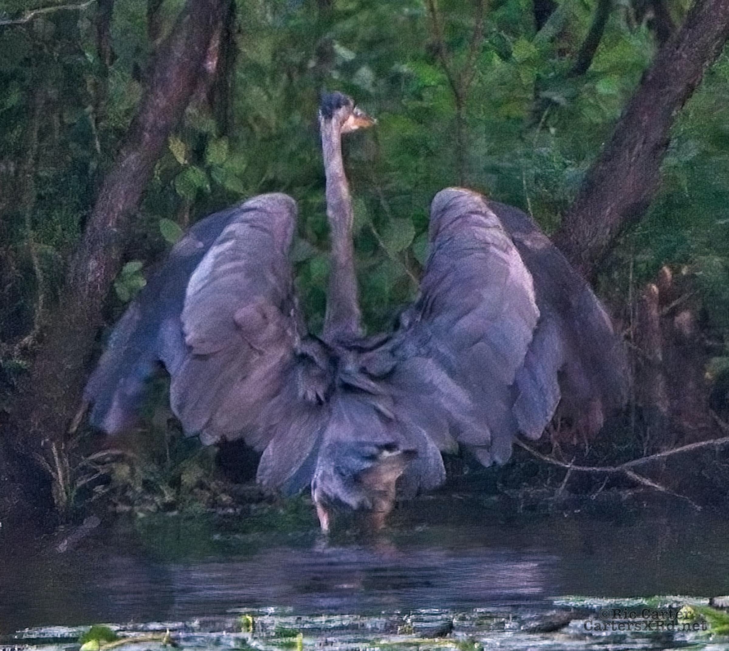 We watched a heron who, as he sometimes does, sat on the other side of the creek watching us at sunset. He got up and moved a little down creek when boat traffic picked up. July 15, 2022.