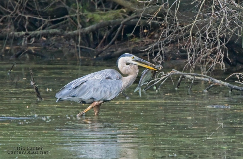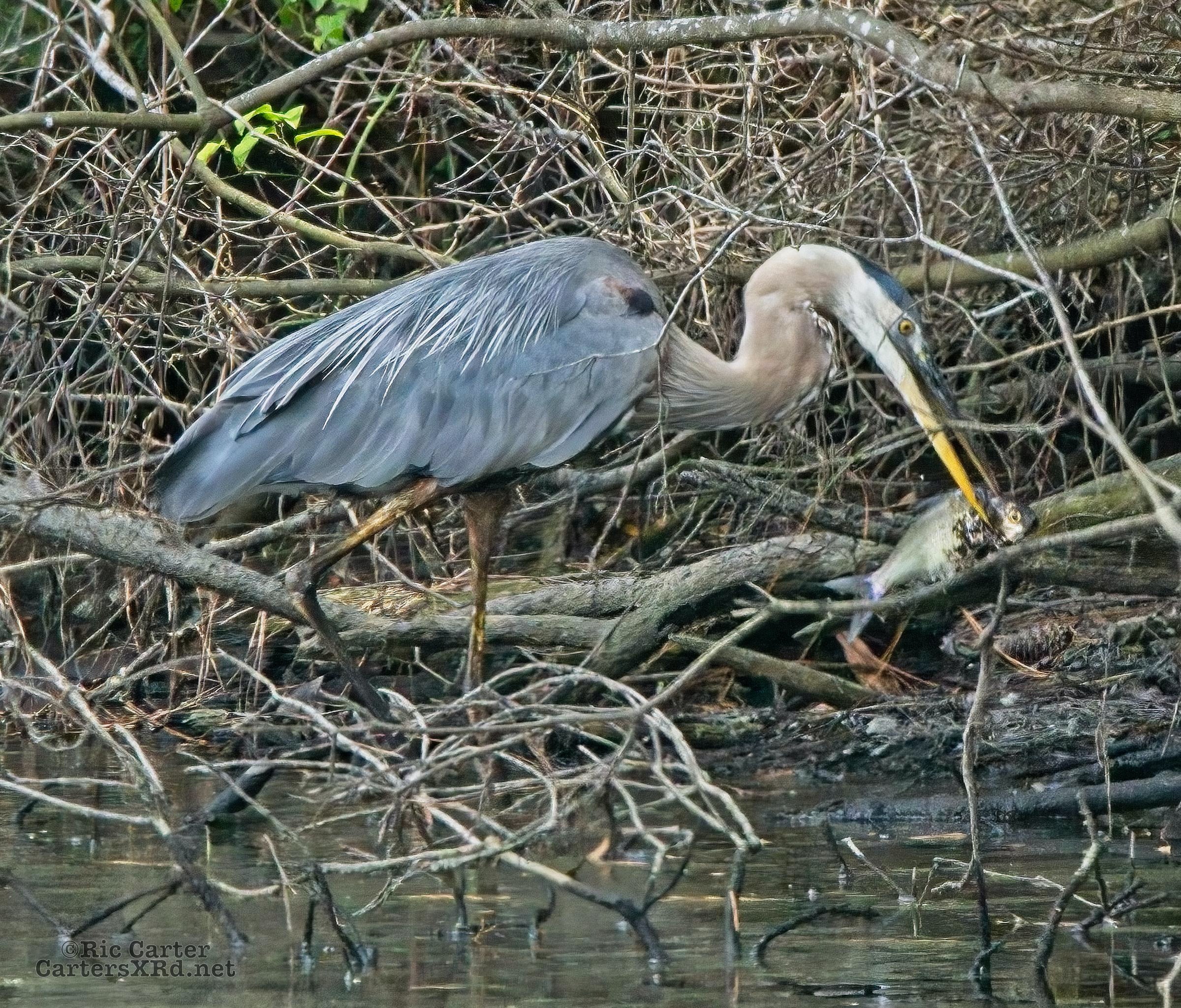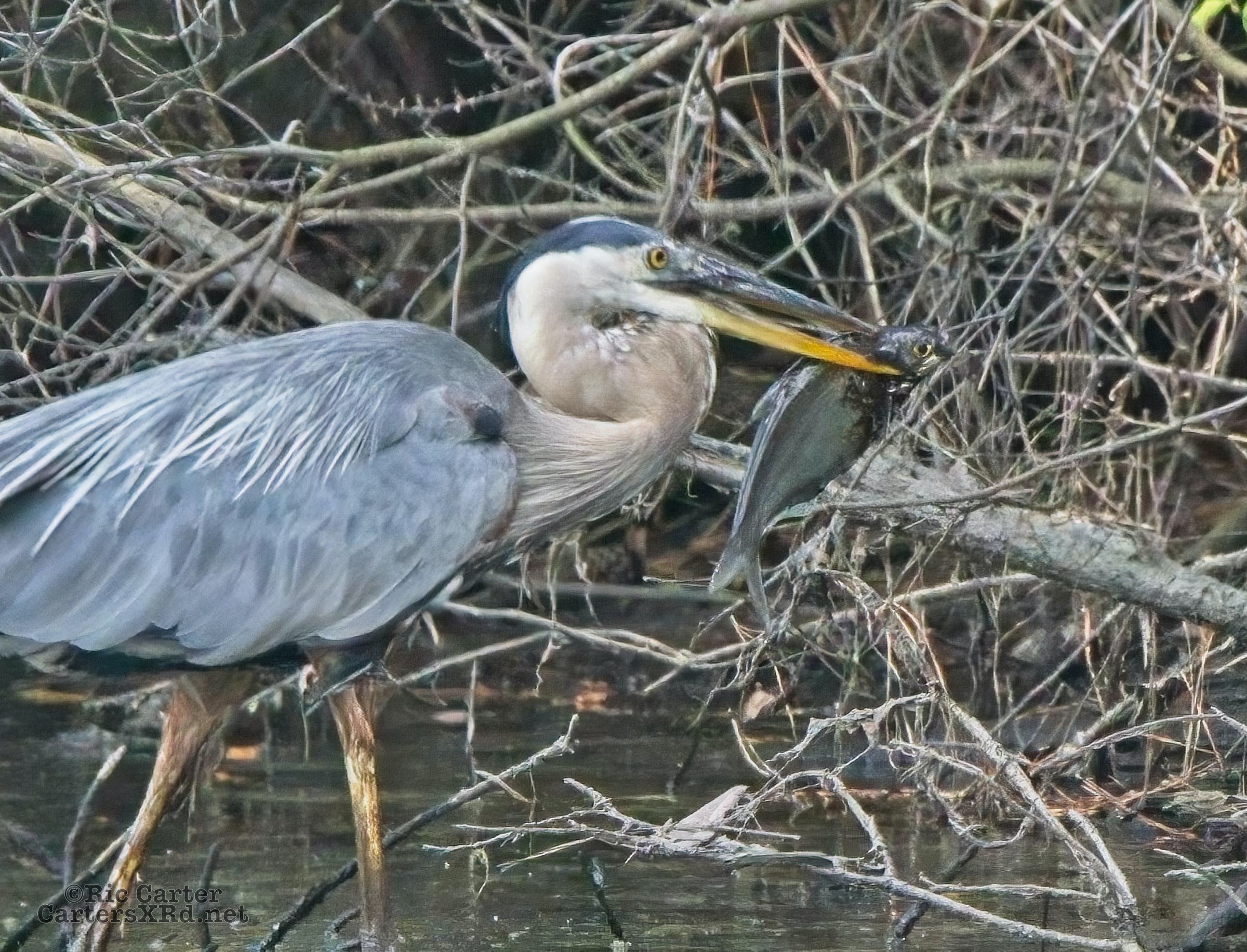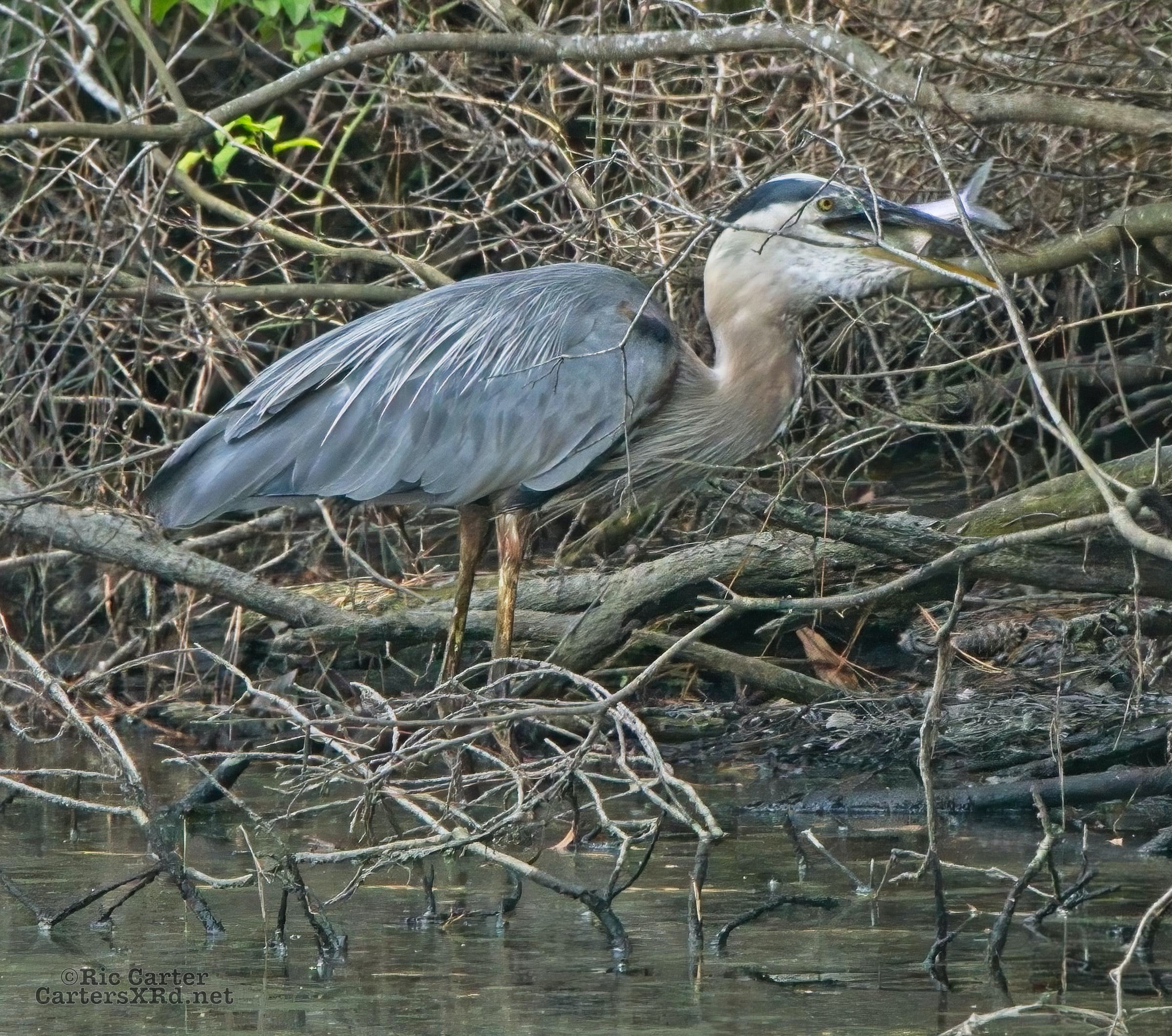 There’s a little canal off the Pamlico River between Summerhaven and Shady Banks east of Washington NC. On July 27, I got to watch a great blue heron snag a catch he was mighty proud of. He actually found a surer perch to get the large shad turned and down his gullet.