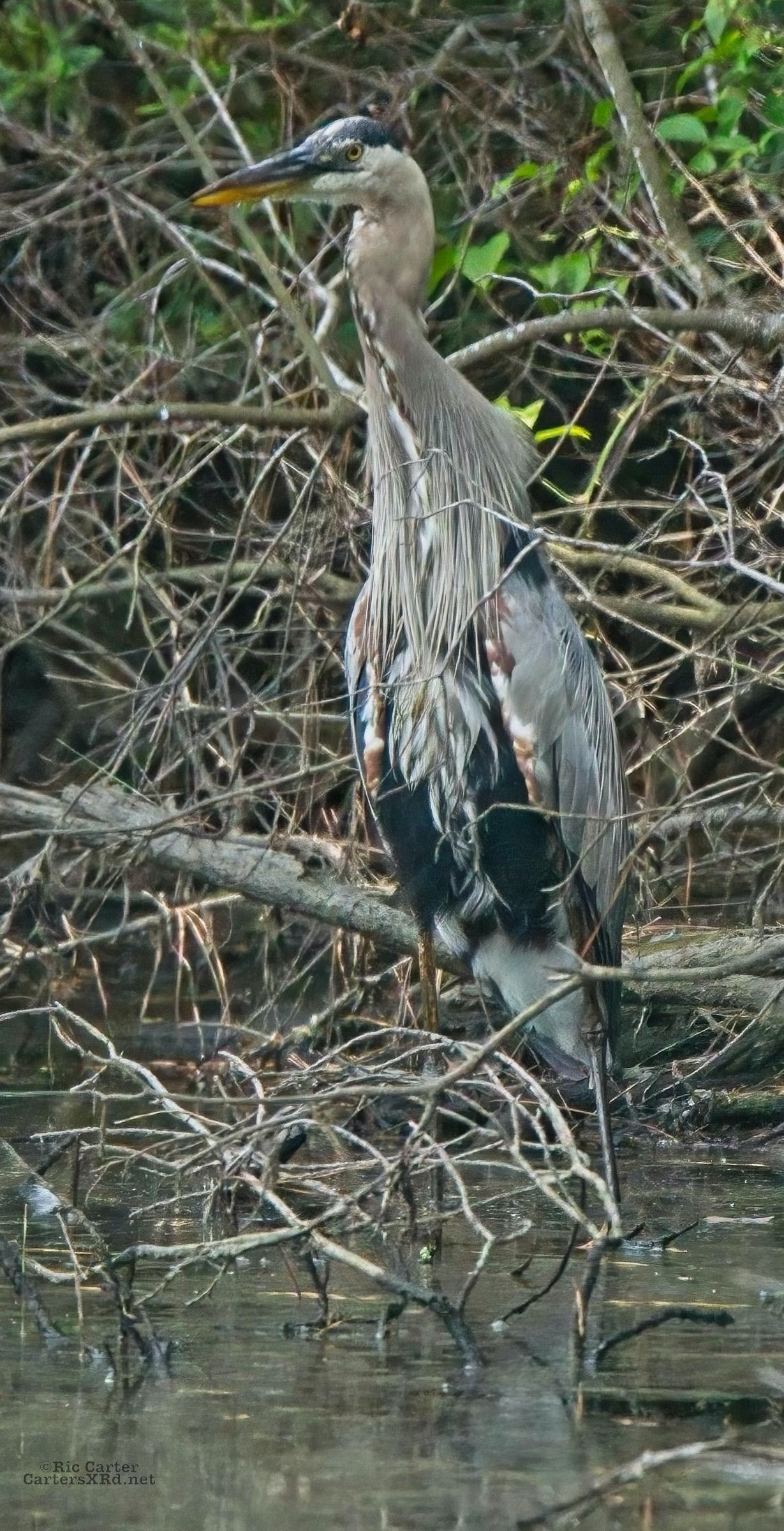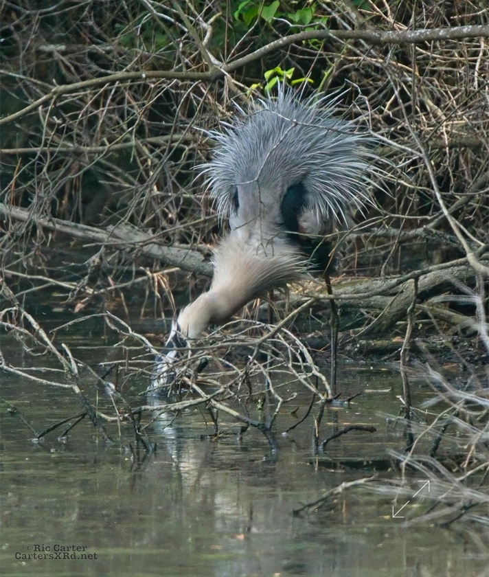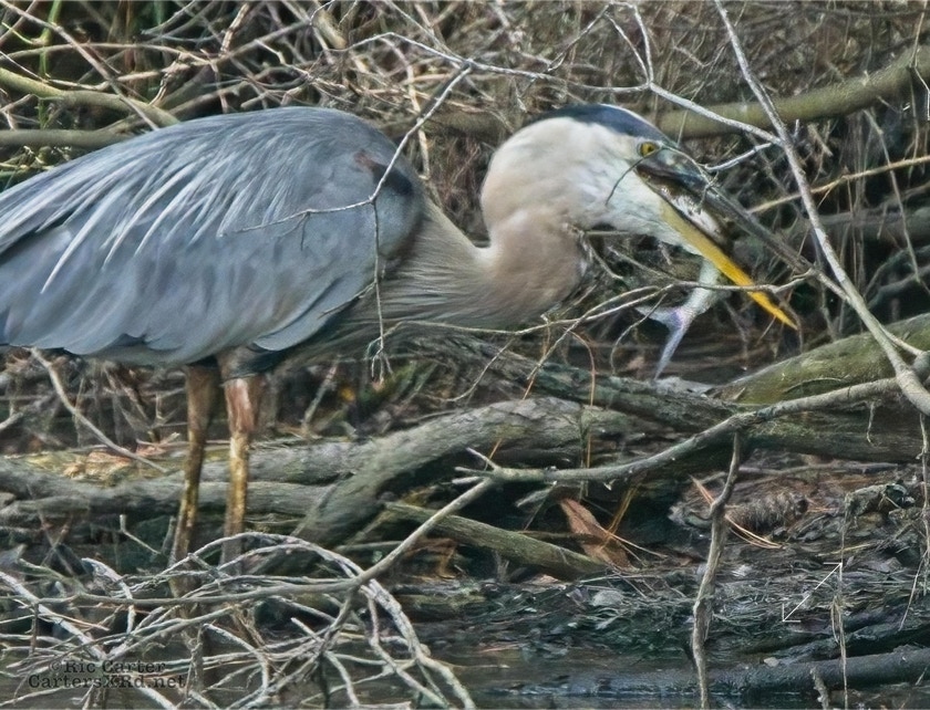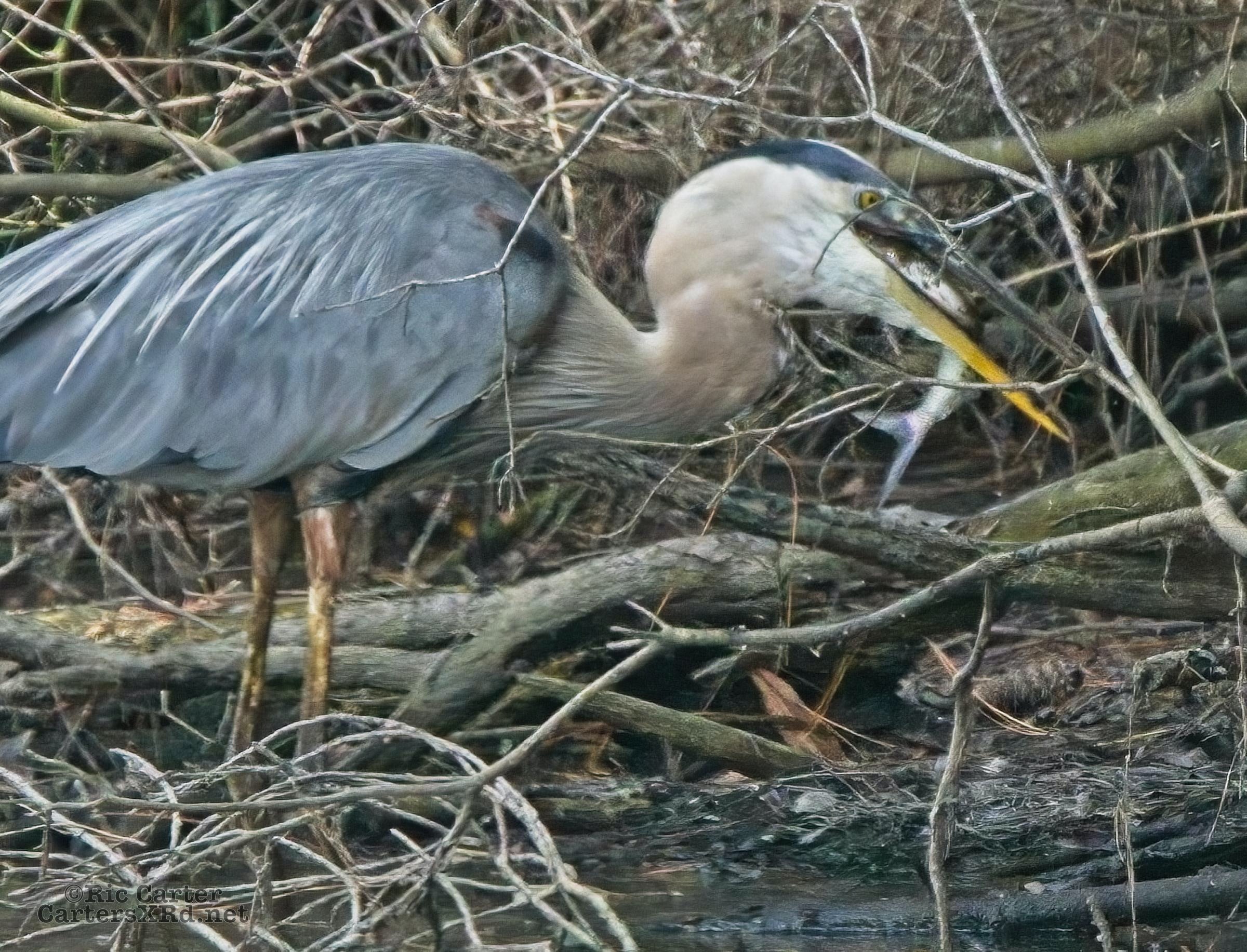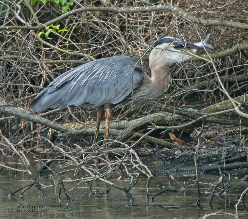 There’s a little canal off the Pamlico River between Summerhaven and Shady Banks east of Washington NC. On July 27, I got to watch a great blue heron snag a catch he was mighty proud of. He actually found a surer perch to get the large shad turned and down his gullet.