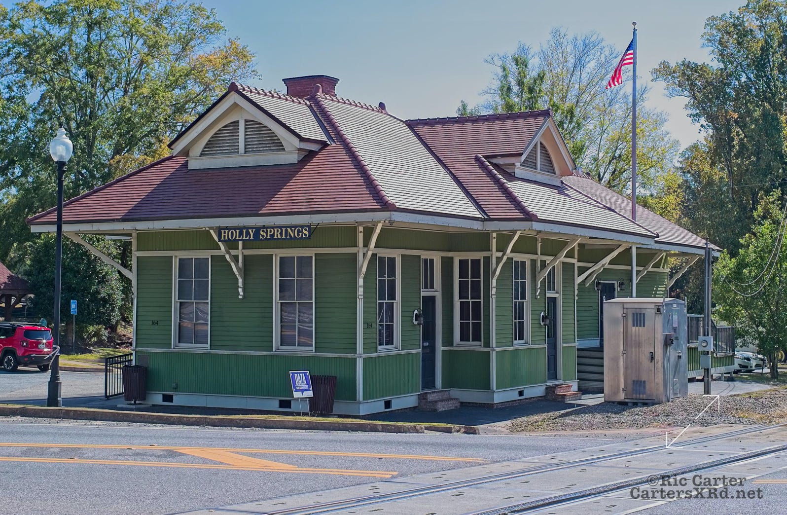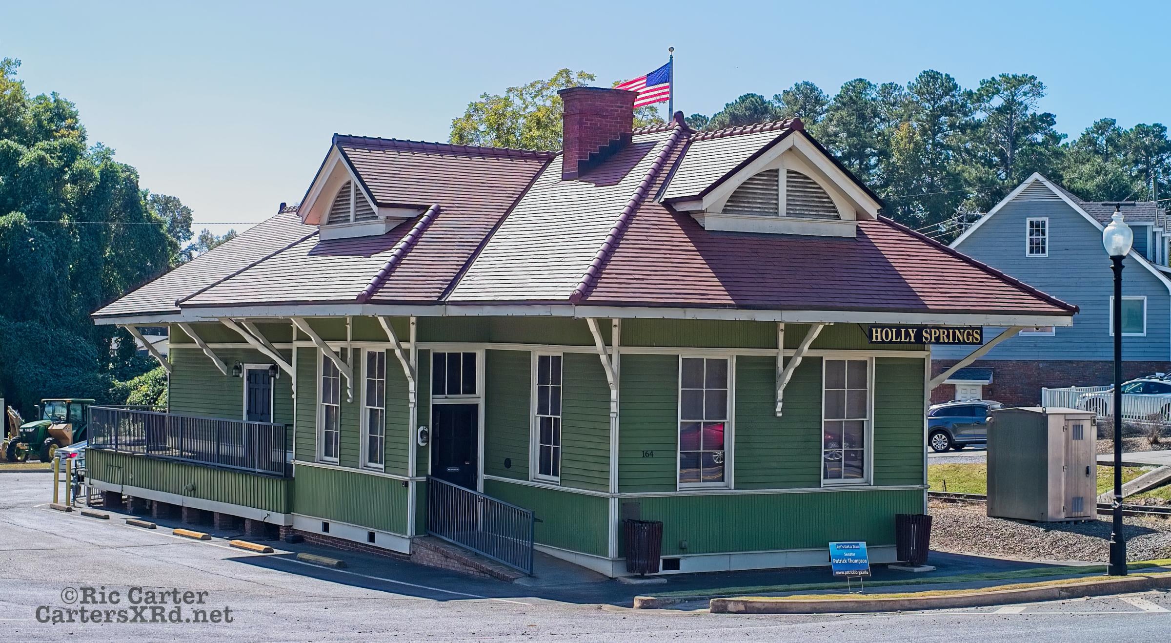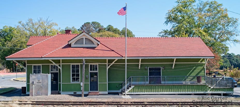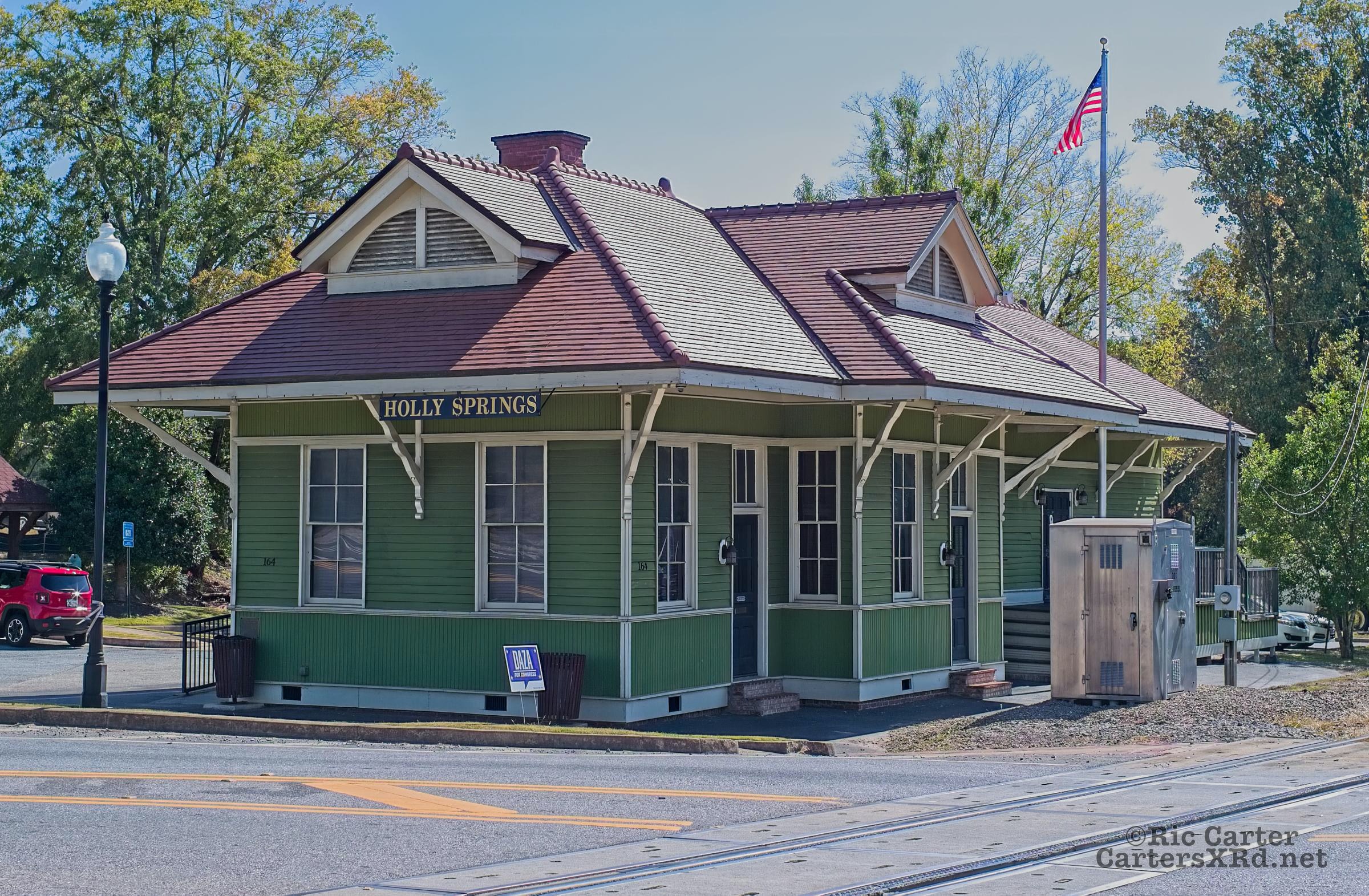 In October, we visited Emily in Roswell. One of the morning trips I took was up to Holly Springs GA to scout track locations now on the Georgia Northeastern line. I took shots of the now restored 1914 Louisville & Nashville Station there. It is now in use as a community building.