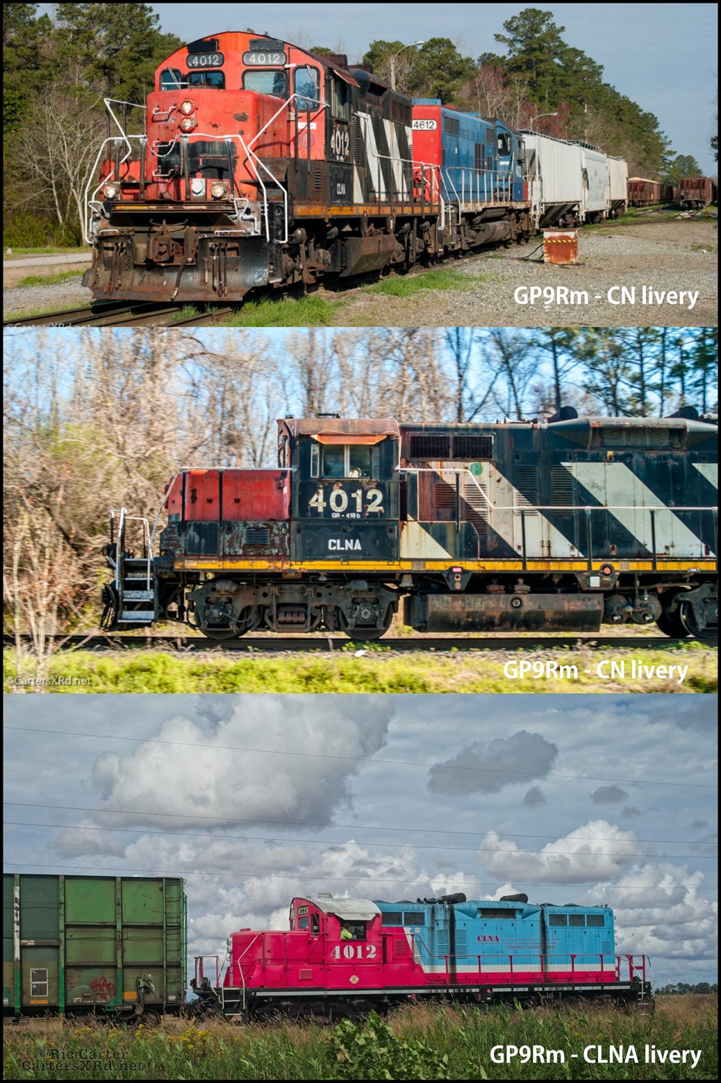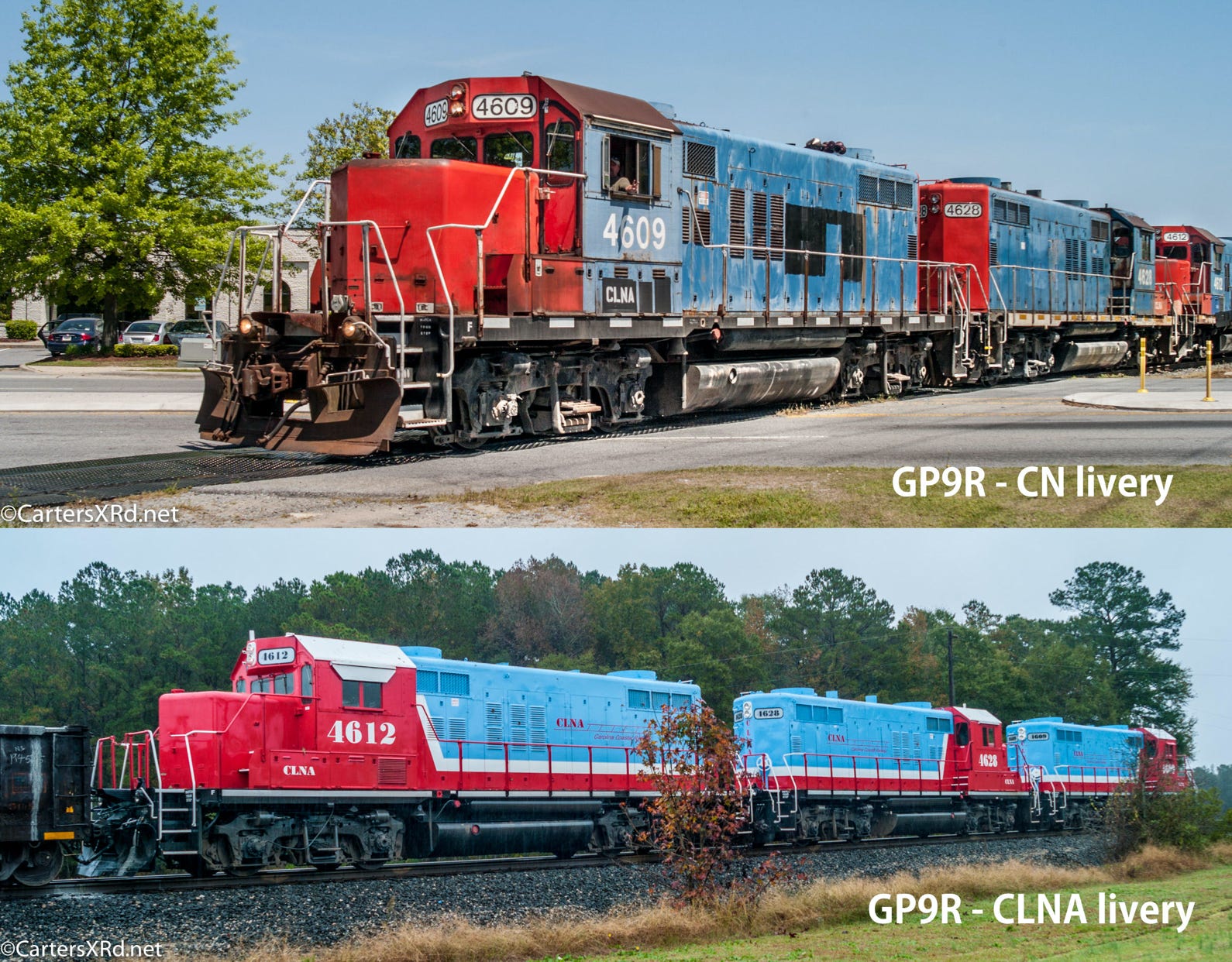 Carolina Coastal Railway has a popular livery among shortline fans. Much of it power force are 1950s GP10. Here are they are in previous colors and current company look.