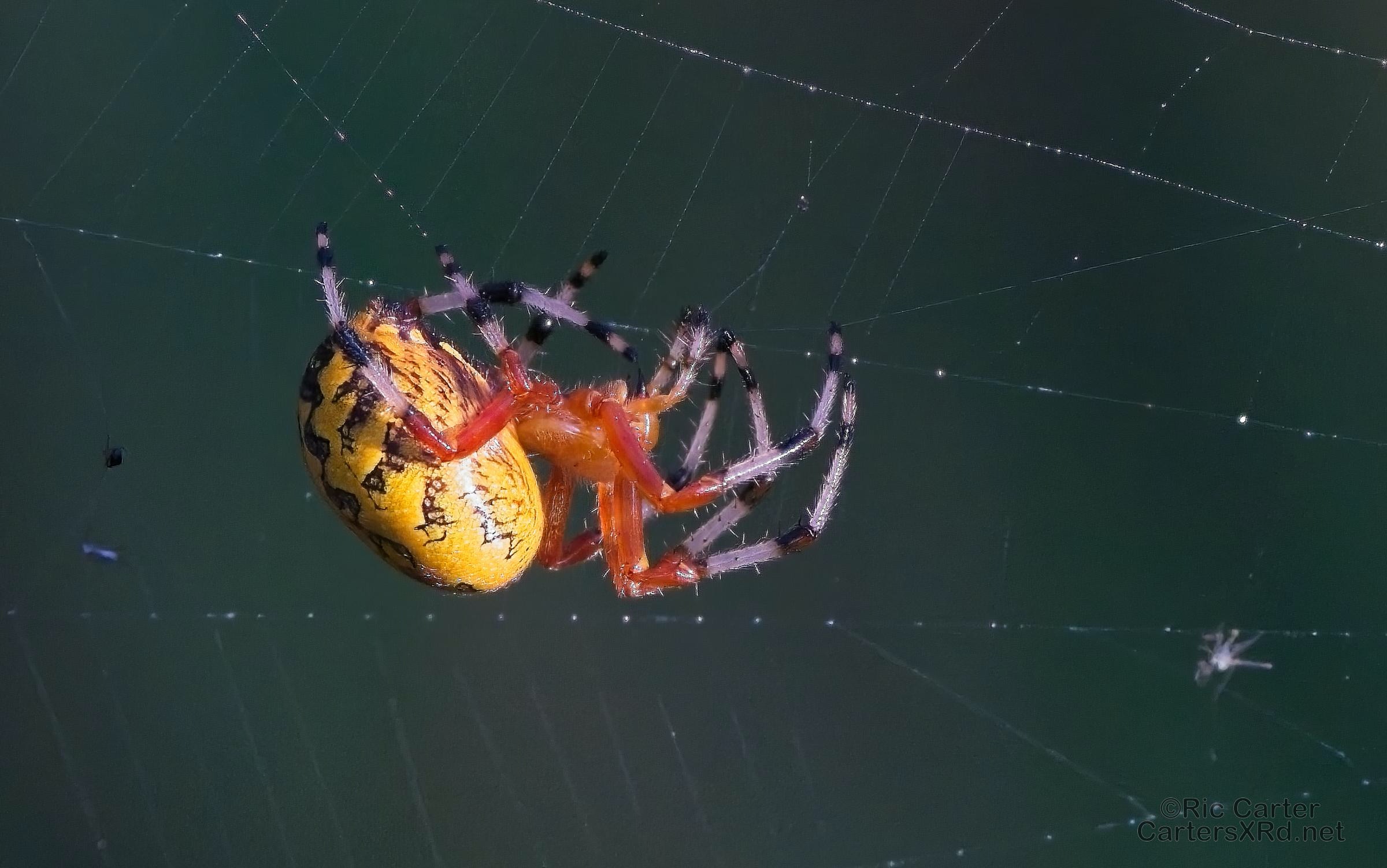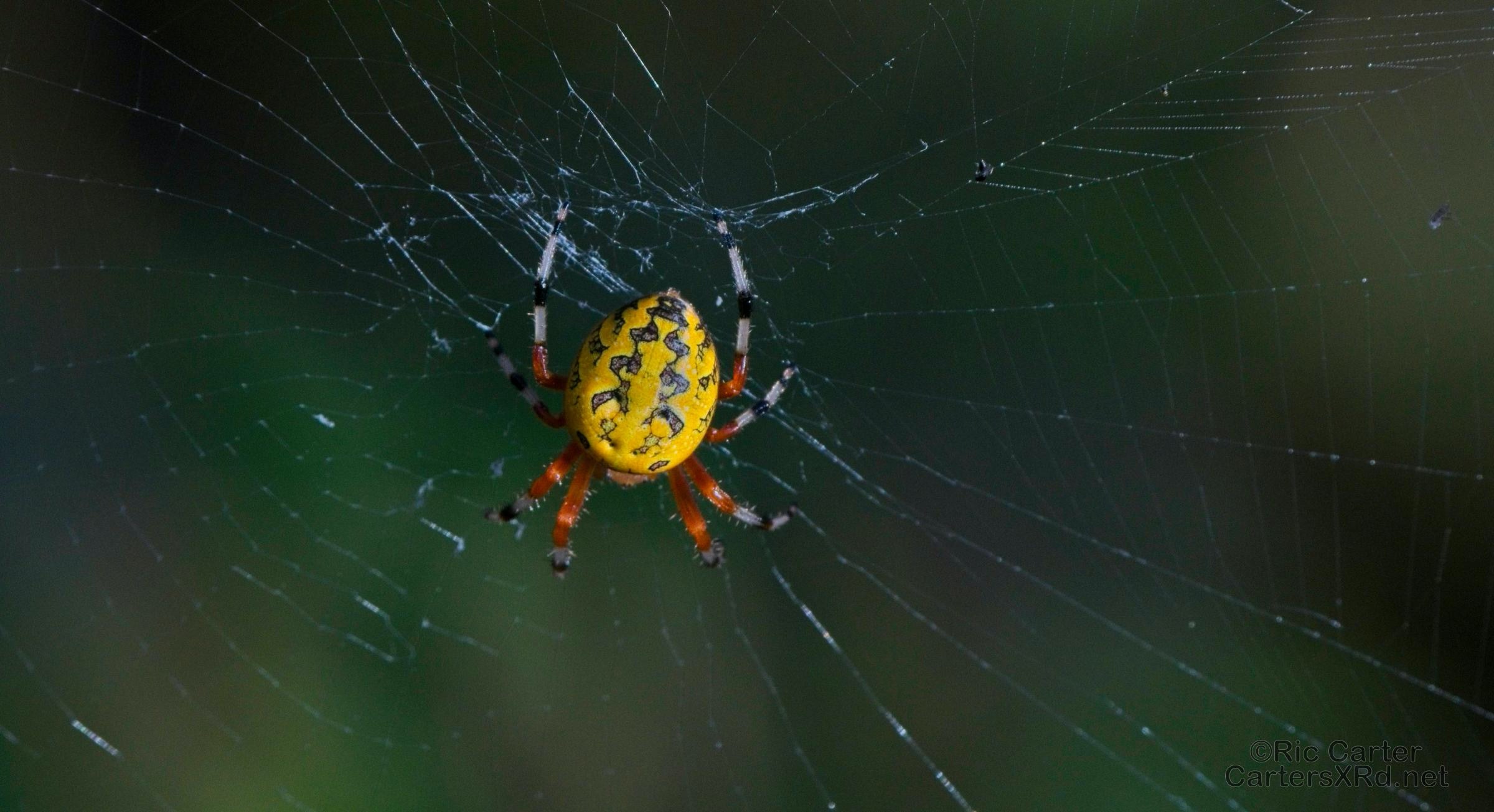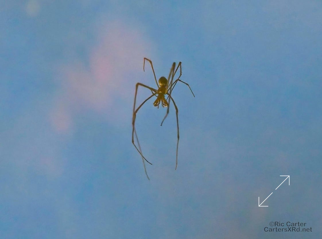 There were a couple of standout spiders in the swamp that is out front yard this past week. The bright guy is a marbled orb weaver. The more subtle fellow is a long-jawed orb weaver.